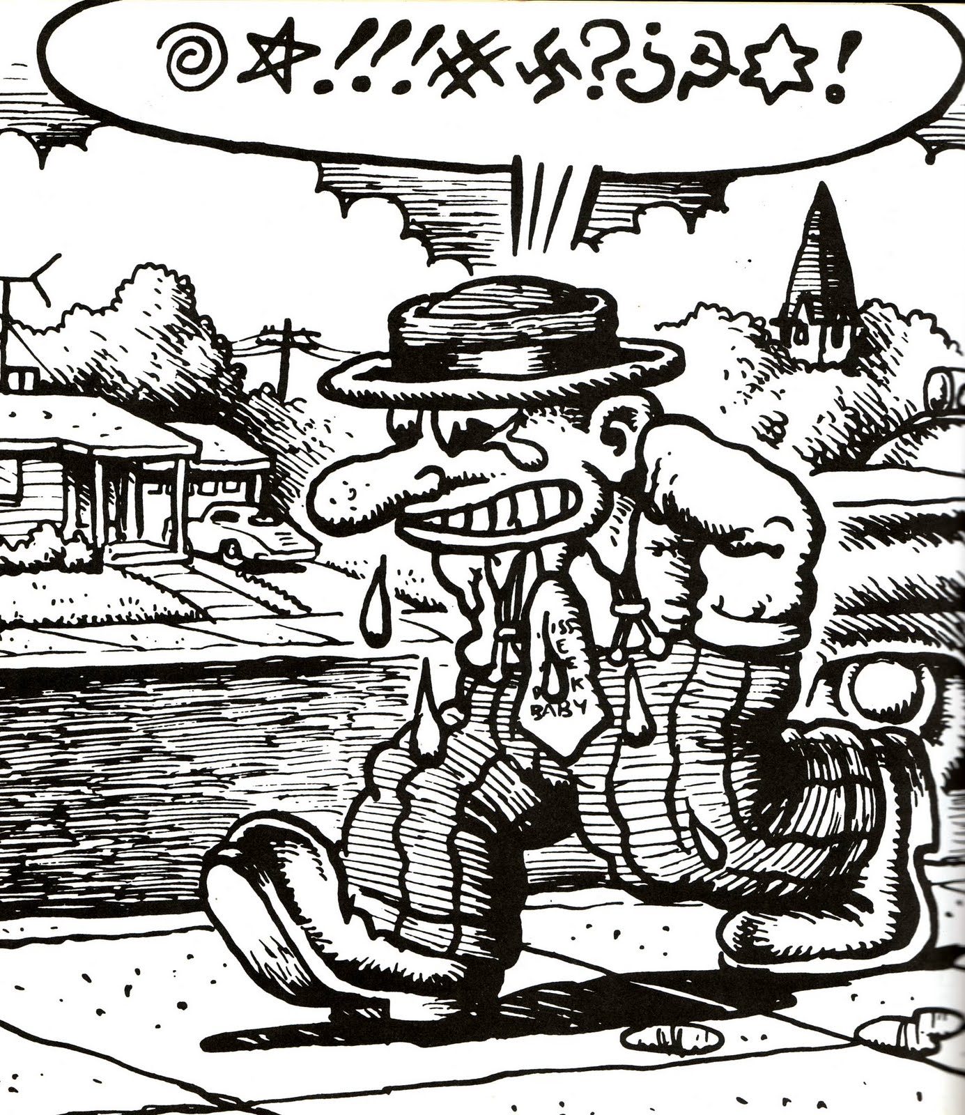 A gang of local handymen and layabouts come to fix the young couple's garage, and we learn that one of the men once went with the girl. He resents the American terribly, of course, and begins to taunt him in various ways. Their cat is hanged in the closet and things like that.